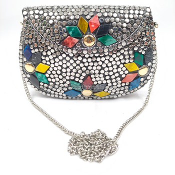 براثن مسائية مصنوعة يدويًا من قبل الحرفيين الهنود لاحتفالات النساء والمناسبات الخاصة محفظة نمط الفسيفساء في المعدن